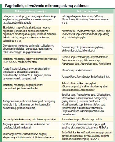 Dirvožemio mikroorganizmus galima suskirstyti į dvi pagrindines grupes: patogeninius ir nepatogeninius. Naudingi augalams, nepatogeniniai mikroorganizmai suskirstyti į dar smulkesnes grupes (žr. lentelę).