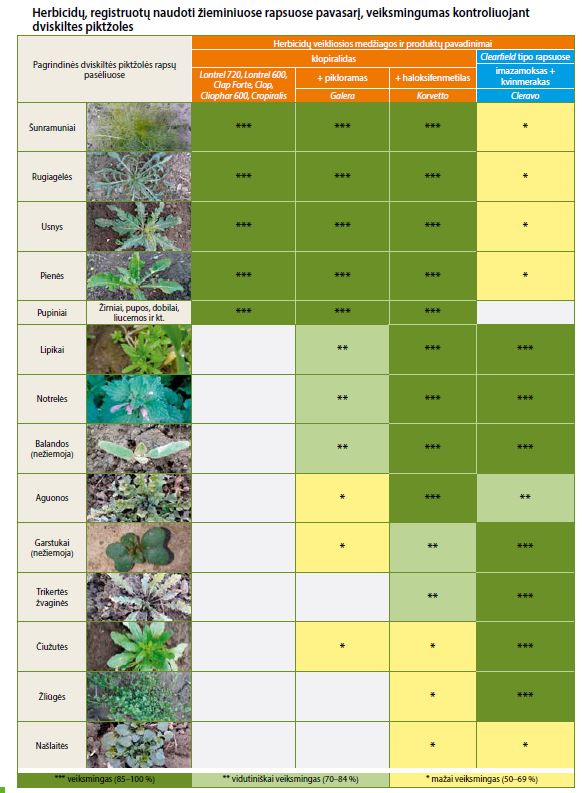 Visų dviskiltėms piktžolėms rapsuose kontroliuoti pavasarį registruotų herbicidų sudėtyje yra klopiralido (Lontrel 720, Lontrel 600, Clap Forte, Clop, Cliophar 600, Cropiralis). Herbicido Galera sudėtyje, be klopiralido, dar yra pikloramo, o į Korvetto sudėtį dar įeina haloksifenmetilas.