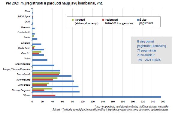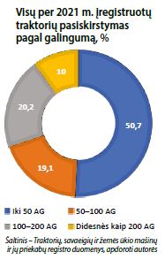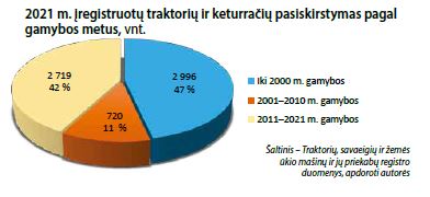 Traktorių, savaeigių ir žemės ūkio mašinų ir jų priekabų registro duomenimis, iš viso 2021 m. gamybos įregistruota 1 699 vnt. technikos (įskaitant ir keturračius), tai sudaro 71,9 proc., 2020 m. gamybos – 663 vnt. arba 28,1 proc. visų 2020–2021 m. gamybos traktorių.