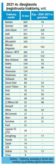 Daugiausia įregistruota Kubota technikos (605 vnt., iš jų 19 vnt. 2020– 2021 m. gamybos), kurios galia prasideda nuo 10 ir baigiasi 144 AG. Antroje vietoje – Yanmar (atitinkamai 588 ir 1 vnt.), kurių galia nuo 11 iki 56 AG, trečioje – John Deere (571 ir 229 vnt.), nuo 30 iki 620 AG galingumo.