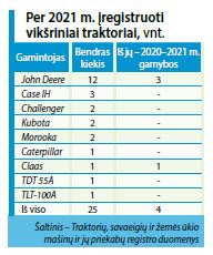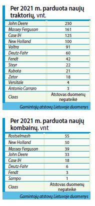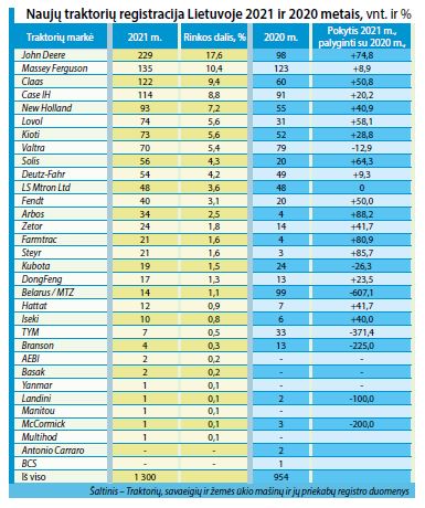 Naujų traktorių, skaičiuojant 2020–2021 m. gamybos techniką, rinkos lyderiai – John Deere, įregistruoti 229 traktoriai. Atstovų duomenimis, pernai įmonė pardavė 230 naujų John Deere traktorių, kurių nemaža dalis sukomplektuota su išmaniosiomis, pvz., duomenų rinkimo, galulaukių apsisukimo ir pan., sistemomis. John Deere traktoriai užima 17,6 proc. įregistruotų naujų traktorių rinkos.