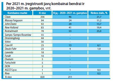 Daugiausia (256 vnt.) pernai įregistruota Claas javų kombainų, populiariausias modelis Lexion (158 vnt.), net 82 jų – su vikšrais. Antroje vietoje – Massey Ferguson (93 vnt.), trečioje – John Deere (92 vnt.), ketvirtoje – New Holland (82 vnt.) ir penktoje – Rostselmash (78 vnt.).