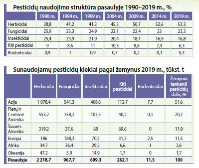 Nagrinėjant pesticidų naudojimo struktūrą pasaulyje pagal paskirtį pastebima, kad didžiausią dalį per nagrinėtą laikotarpį sudarė herbicidai – jų naudojimas išaugo nuo 38,8 proc. 1990-aisiais iki 53,3 proc. 2019 m. (2,5 karto – iki 2,2 mln. tonos).