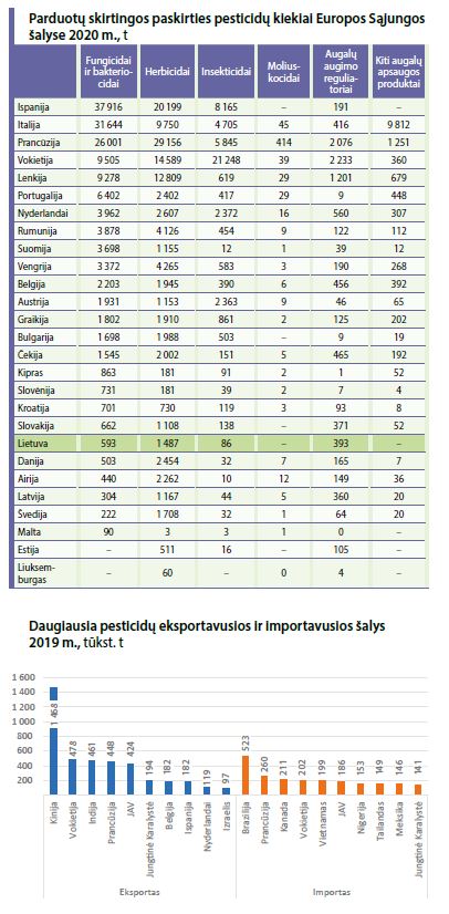Mūsų šalyje 2020 m. parduota 1,5 tūkst. t herbicidų, o fungicidų ir bakteriocidų tik 600 tonų. Europoje insekticidų daugiausia nuperka Vokietija – net kelis kartus viršijo pardavimus Ispanijoje, kuri pagal parduotus kiekius yra antroje vietoje. Vokietija ir Prancūzija pirmavo pagal augalų augimo reguliatorių pardavimus. Šių priemonių Lietuvoje parduota apie 400 t (Latvijoje ir Slovakijoje panašiai).