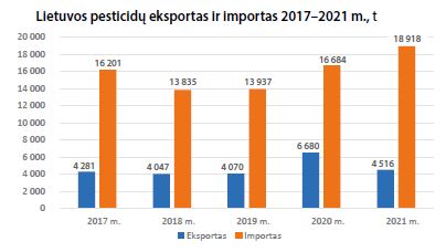 Remiantis Lietuvos statistikos departamento duomenimis, mūsų šalis per pastaruosius penkerius metus pesticidų importavo kelis kartus daugiau nei eksportavo. Pesticidai pernai įvežti iš 34 valstybių, daugiausia iš Lenkijos (5,1 tūkst. t – 26,7 proc. viso importuoto kiekio), Danijos (2,5 tūkst. t – 13,2 proc.) ir Vokietijos (2,4 tūkst. t – 12,5 proc.). Lietuva minėtais metais pesticidų eksportavo į 40 šalių, tačiau didžiausi kiekiai išvežti į Rusiją (1,6 tūkst. t – 35,8 proc. viso eksportuoto kiekio), Latviją (1,1 tūkst. t – 24,5 proc.) ir Baltarusiją (0,5 tūkst. t – 11,2 proc.).