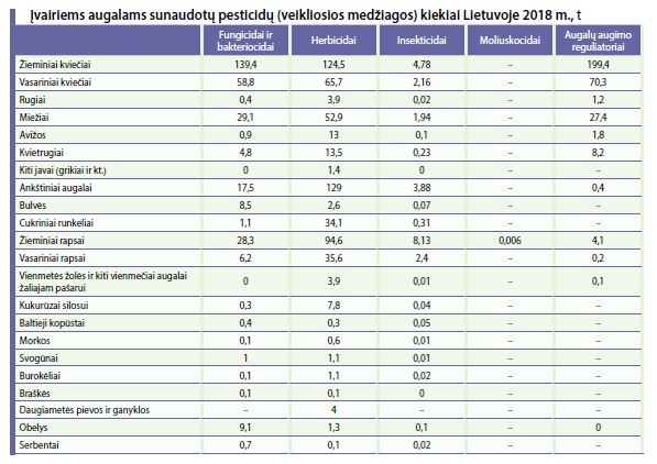 Remiantis Eurostato ir Lietuvos statistikos departamento duomenimis, mūsų šalyje 2018 m. žieminių kviečių pasėliams teko didžiausias bendras fungicidų, bakteriocidų ir herbicidų kiekis (veikliosios medžiagos), o rapsų pasėliams – insekticidų. Moliuskocidai naudoti tik žieminių rapsų apsaugai. Skaičiuojant vienam hektarui pasėto ploto, pastebėta, kad didžiausias fungicidų ir bakteriocidų kiekis teko bulvėms (0,4 kg/ha) ir žieminiams kviečiams (0,3 kg/ha), herbicidų – cukriniams runkeliams (2,1 kg/ha), ankštiniams augalams (0,7 kg/ha) ir žieminiams rapsams (0,7 kg/ha), insekticidų – žieminiams (0,06 kg/ha) ir vasariniams rapsams (0,04 kg/ha).