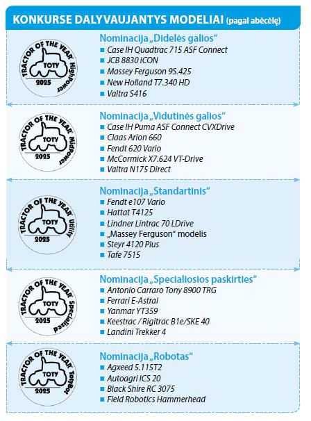 Atsinaujinusiame konkurse „Metų traktorius 2025“ („Tractor of the Year“ – „TotY“) šiemet dalyvauja 16 gamintojų, kurie pristato 17 prekių ženklų net 21 traktorių modelį (palyginti, 2023 m. konkurse dalyvavo 9 gamintojai, kurie pristatė 13 traktorių modelių). Traktorius vertina, jų techninius parametrus pagal tam tikrus kriterijus analizuoja ir laimėtojus renka 25 žurnalistai iš 25 šalių.