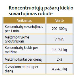 Lentelėje pateikti skaičiavimai padeda suprasti, kiek koncentratų karvė gali suėsti per vieną melžimą, atsižvelgiant į laiką ir melžimo kartus per dieną. Didžiausią dėmesį reikia skirti raciono balansui išlaikyti – koncentratų kiekis robote turėturėtų būti minimalus, o pagrindinė energija gaunama iš PMR.