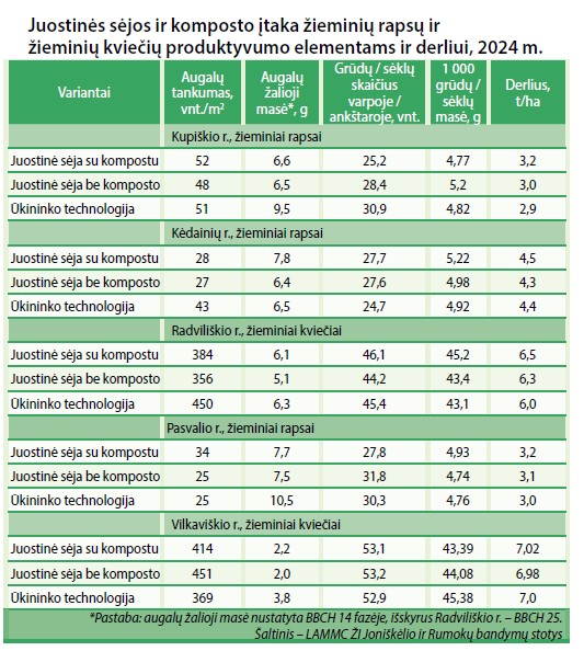 Lietuvos agrarinių ir miškų mokslų centro Žemdirbystės instituto Joniškėlio ir Rumokų bandymų stoties mokslininkai 2023–2024 m. atliko tyrimus, kurių tikslas – įvertinti tiesioginės juostinės sėjos efektyvumą ir granuliuoto organinio komposto poveikį žieminių javų ir rapsų produktyvumui. Kadangi rezultatai priklauso nuo dirvožemio sudėties ir būklės, juostinės sėjos taikymo eksperimentai buvo atliekami keliose Lietuvos apskrityse, kuriose vyravo nevienodos oro sąlygos, skirtingos sudėties dirvožemiuose – Radviliškio, Kupiškio, Kėdainių, Pasvalio, Vilkaviškio rajonų ūkininkų ūkiuose. Eksperimento laukeliuose žieminiai kviečiai ir rapsai sėti nauja lietuvių padargų gamintojo juostine sėjamąja RS-3.