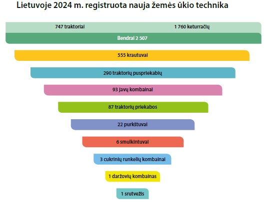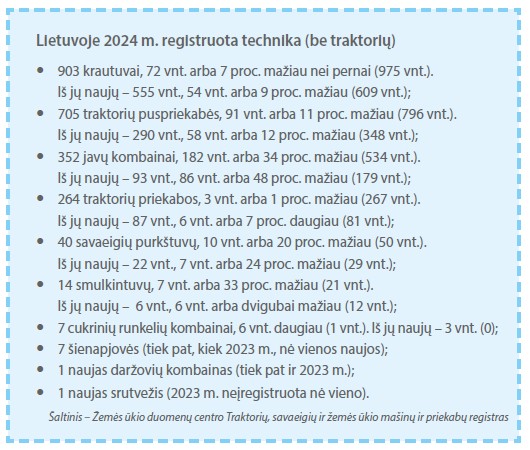 Technikos rinkos susitraukimą atspindi ne tik traktorių, bet ir kitos savaeigės žemės ūkio technikos registravimo duomenys. Ypač didelis kritimas 2024 m. užfiksuotas javų kombainų rinkoje, mažiau įregistruota ir krautuvų, puspriekabių, purkštuvų, smulkintuvų.