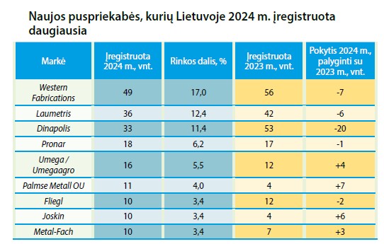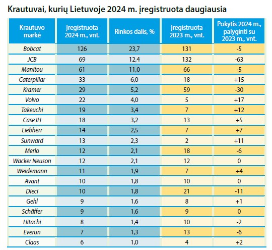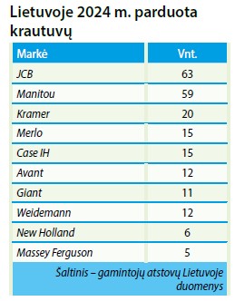 Gamintojų atstovų („Lytagra“, „Intrac Lietuva“, „DOJUS agro“, „Rovaltra“, „Dotnuva Baltic“, „Stokker“, „East West Agro“, „Agrokoncerno technika“ ir „SV Technika“) duomenimis, 2024 m. Lietuvoje parduota 63 vnt. JCB (įregistruota 6 vnt. daugiau), 59 Manitou (įregistruota 2 daugiau), 20 Kramer (įregistruota 9 daugiau), 15 Merlo (įregistruota 3 mažiau), 15 Case IH (įregistruota 3 daugiau), 12 Avant (įregistruota 2 mažiau), 11 Giant (įregistruota 6 mažiau), 12 Weidemann (įregistruota 1 mažiau), 6 New Holland (įregistruota 2 mažiau) ir 5 Massey Ferguson (tiek pat ir įregistruota) nauji krautuvai.
