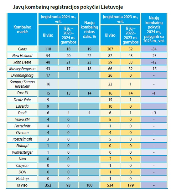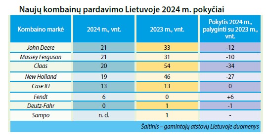 Gamintojų atstovų („DOJUS agro“, „Lytagra“, „Baltic Agro Machinery“,„East West Agro“, „Dotnuva Baltic“ ir „Ivabaltė“) duomenimis, pernai Lietuvoje parduota: John Deere ir Massey Ferguson kombainų – po 21, Claas – 20, New Holland – 19, Case IH – 13, Fendt – 6 kombainai.