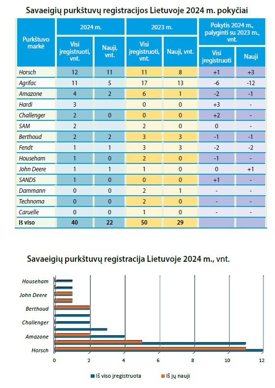 Pernai mažiau įregistruota savaeigių purkštuvų – bendrai 20 proc., naujų – 24 proc. mažiau nei 2023 metais. Iš viso 2024 m. į Registrą įrašyta 40 purkštuvų, tarp jų naujų – 22 vienetai. Įregistruota 11 prekių ženklų purkštuvų (nauji – 6 gamintojų: 14 vnt. pagaminti 2024 m., 7 vnt. – 2023 metais).