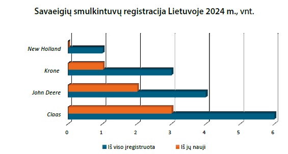 Traktorių, savaeigių ir žemės ūkio mašinų ir priekabų registro duomenys rodo, kad 2024 m. iš viso įregistruota 14 smulkintuvų arba 33 proc. mažiau, tarp jų naujų – 6 vnt. arba dvigubai mažiau nei 2023 metais. Bendrai įregistruota 4-ių, nauji – 3-ų gamintojų smulkintuvai. Tiek iš viso, tiek naujų daugiausia įregistruota Claas, John Deere, Krone. Seniausias pernai įregistruotas smulkintuvas – 1995 m. gamybos Claas Jaguar 840. Nepaisant gamybos metų, visi 14 smulkintuvų pernai Lietuvoje įregistruoti pirmą kartą.