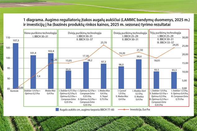 Lietuvos agrarinių ir miškų mokslų centre (LAMMC) 2025 m. atlikti tyrimai su žieminių kviečių veisle Skagen parodė, kad efektyviausia augimo reguliatorių technologija yra trijų purškimų derinys. Taikant šią technologiją, augalo stiebas sutrumpėjo beveik 14 cm, o derlius padidėjo apie 400 kg/ha.