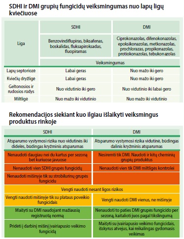DMI grupės fungicidai dėl plataus veikimo spektro vis dar lieka svarbūs ligų kontrolės technologijose ir kartu atsparumo valdymo strategijoje naudojant juos mišiniuose su SDHI fungicidais. SDHI grupės veikliąsias medžiagas turintys fungicidai šiuo metu pasižymi labai geru veiksmingumu nuo lapų dėmėtligių, mažina kitų ligų plitimą. Deriniuose su kitų cheminių grupių, tarp jų ir DMI, puikiai papildo vieni kitus.
