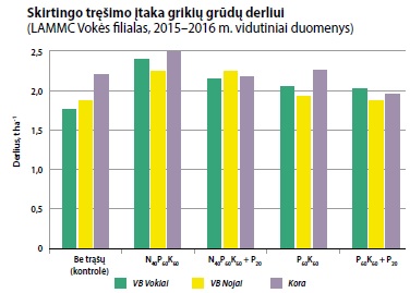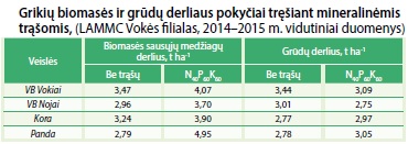 Lietuvos klimato sąlygomis LAMMC Vokės filiale priesmėlio dirvožemyje atliktų tyrimų rezultatai parodė, kad, patręšus grikius N40P60K60, labai didėjo biomasės derlius, tačiau grūdų derlius didėjo ne visų veislių.