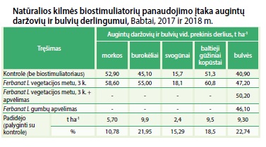 Padidėjo gaunamos pajamos ir pelnas: auginant morkas pajamos padidėjo 10,76 proc. arba 1 311,00 Eur ha-1, gaunamas pelnas padidėjo – 1 233,19 Eur ha-1; burokėlių pasėlyje – atitinkamai 22,0 proc. arba 1 782,00 Eur ha-1 ir 1 704,19 Eur ha-1; svogūnų pasėlyje 15,3 proc. arba 432,00 Eur ha-1 ir 354,19 Eur ha-1; baltųjų gūžinių kopūstų pasėlyje 19,5 proc. arba 1 900,00 Eur ha-1 ir 1 822,15 Eur ha-1. Panaudojus biostimuliatorių Ferbanat L bulvių pasėlyje, apdorojant sėklą (beicavimo metu) ir papildomai tręšiant per lapus per vegetaciją, pajamos padidėjo 28,1 proc. arba 1 998,00 Eur ha-1, pelnas padidėjo 1 881,84 Eur ha-1.