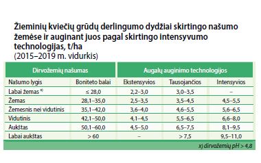 Lietuvoje 2019 m. vasarą deklaruota net 740 209 ha žieminių kviečių pasėlių, iš kurių prikūlėme apie 3,7 mln. t grūdų, o vidutinis derlingumas buvo apie 5 t/ha. 2019 m. rudenį žieminių kviečių pasėta ne mažiau negu užpernai, nes kviečius auginti daug pelningiau negu kitų rūšių javus. Be to, juos auginti esame palyginti neblogai išmokę. Tai rodo ir per pastaruosius penkerius metus gauti vidutiniai derlingumo dydžiai skirtingo našumo žemėse.