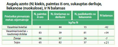 Bendras augalo sukaupto azoto kiekis buvo didžiausias auginant raudonųjų dobilų ir vasarinių miežių įsėlį (119,6– 137,6 kg N/ha). Tačiau panašų azoto kiekį gali sukaupti ir sojos (118,9 kg/ha) bei žirniai (121,1 kg/ha), esant palankioms augimo sąlygoms. Didžioji dalis azoto (69 ir 80 proc.) susikaupia sojų ir žirnių grūduose, ir šis azotas išvežamas su derliumi. Ir atvirkščiai, raudonieji dobilai, įsėti į vasarinius miežius, didžiąją dalį azoto (59–68 proc.) sukaupia organinėse liekanose.