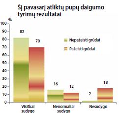 Šį pavasarį atlikus 2019 m. išaugintų pupų analizę matomos panašios tendencijos – pažeistos sėklos sudygo 12 procentinių punktų prasčiau negu pupinių grūdinukų nepažeistos. Reikėtų atkreipti dėmesį, kad nemenkas kiekis tiek sveikų, tiek pažeistų pupų vystėsi lėčiau ir buvo įvertinta, kad sudygo nenormaliai. Tačiau net 18 proc. pažeistų sėklų nesudygo visai, o nepažeistų - tik 2 proc. Šie duomenys akivaizdžiai patvirtina neigiamą pupinių grūdinukų įtaką daigumui.