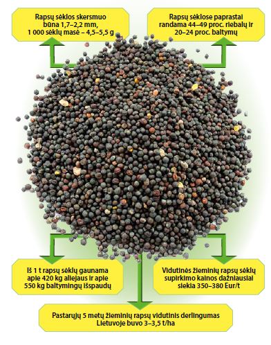 Perdirbėjai iš 1 t rapsų sėklų gauna apie 420 kg aliejaus ir apie 550 kg baltymingų išspaudų. XXI a. pradžioje, kai padidėjo rapsų pasėlių plotai, Lietuva pirmą kartą įgijo galimybę aprūpinti šalies gyventojus savos gamybos augaliniu aliejumi, o gyvulininkystės poreikiams turėti augalinės kilmės ir aukštos vertės baltymų. Ilgainiui rapsų sėklos pradėtos eksportuoti, ir čia mes esame neblogi „žaidėjai“ visos Europos mastu.