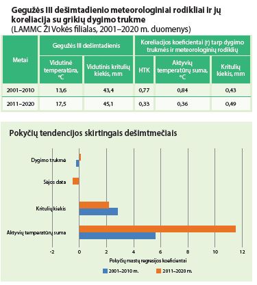 2001–2010 m. laikotarpiu grikių dygimo trukmę labiau nulėmė aktyvių temperatūrų suma (r = 0,84) negu kritulių kiekis. Tai susiję su vidutine temperatūra, kuri buvo vidutiniškai 3,9 ºC žemesnė negu 2011–2020 m. Todėl dygimo trukmė priklausė nuo veiksnio, kurio labai trūko: kai gegužės pabaigos orai buvo vėsesni, grikių dygimo trukmė nuo aktyvių temperatūrų sumos priklausė 70 proc., o esant pakankamai šilumos ir tam pačiam kritulių kiekiui, dygimo trukmė beveik vienodai priklausė nuo abiejų rodiklių.