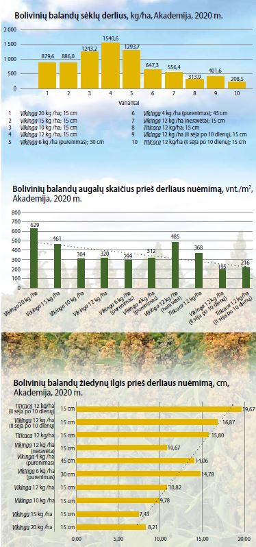 Bolivinių balandų veislių 1 000 sėklų svoris po nukūlimo esmingai skyrėsi. Ir ankstesnės, ir vėlesnės sėjos veislės Titicaca sėklos buvo stambesnės, palyginti su Vikinga. Bolivinių balandų veislių derlingumas kito nuo 208,5 iki 1 540,6 kg/ha. Sėklų derliai veislės Vikinga buvo patikimai didesni I sėjos laiku (gegužės 15 d.) 15 cm tarpueiliais, palyginti su II sėja (gegužės 25 d.). Tarpueilių didinimas ir sėjos normos mažinimas sumažino bolivinių balandų sėklų derlių.