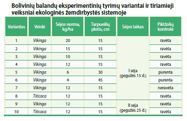 Bolivinių balandų lauko eksperimente vertinti tokie kriterijai, kaip augalų veislė, sėjos norma, tarpueilių plotis, sėjos laikas, mechaninis piktžolių naikinimo būdas. Bandymuose augintos balandų veislės Vikinga ir Titicaca, kurios selekciniu būdu sukurtos Danijoje.