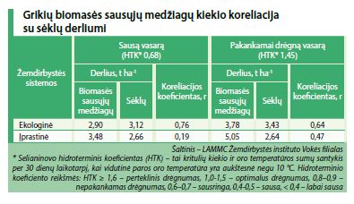 Be to, stipresnė grikių derliaus priklausomybė nuo biomasės (r = 0,75) buvo, kai per augalų vegetaciją vasarą iškrito mažai kritulių (111 mm, o HTK* buvo 0,68), negu drėgnesnę vasarą (r = 0,64), kai kritulių buvo dvigubai daugiau (233 mm, HTK* 1,45).