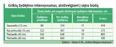 Užsienyje atliktų tyrimų duomenimis, siauraeiliu būdu pasėti grikiai iš viso per žydėjimą suformuoja 1,4–2,2 karto mažiau žiedų nei pasėti platesniais tarpueiliais.