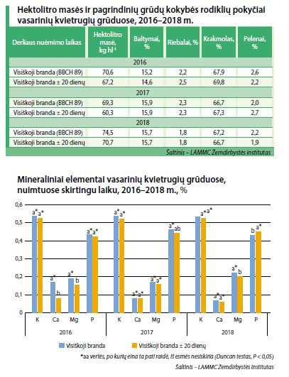 Buvo nustatyta, kad derliaus nuėmimo vėlinimas didžiausią įtaką turėjo hektolitro masės rodikliui. Kiti analizuoti grūdų kokybės rodikliai skirtingais metais ženkliai nesiskyrė, tačiau lietingais 2017 m., vėlinant derliaus nuėmimą, pastebėtas reikšmingai padidėjęs pelenų kiekis grūduose, kuris greičiausiai daugiau siejamas su higienine grūdų tarša, o ne su mineralinių elementų kiekio kitimu.