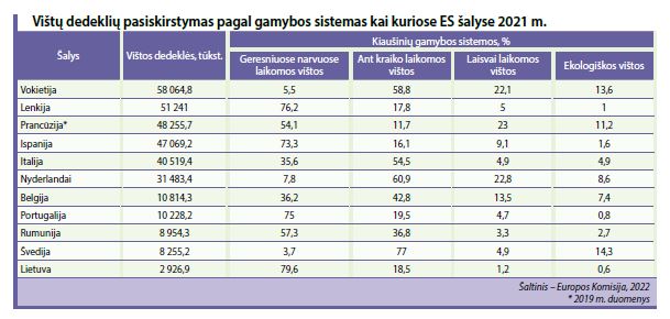 Pagal kiaušinių svorį 2021 m. svarbiausių ES kiaušinių gamintojų septintuke buvo Prancūzija, Vokietija, Ispanija, Italija, Nyderlandai, Lenkija ir Rumunija. Šios šalys pagamino net tris ketvirtadalius viso ES kiaušinių kiekio. Lietuvoje pagaminti nesiekė net 1 proc. ES pagamintų kiaušinių svorio. Daugiausia narvuose laikomų dedeklių yra Lietuvoje, Lenkijoje, Portugalijoje, Ispanijoje. Kitos šalys pasižymi didesne gamybos sistemų įvairove ir stengiasi reaguoti į visuomenės susirūpinimą dėl gyvūnų gerovės.