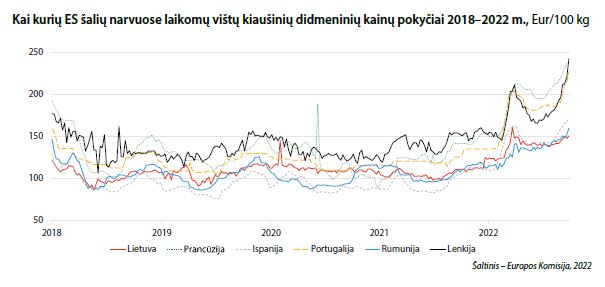 Pagal kiaušinių kainas Lietuvą, kaip ir Ispaniją ar Rumuniją, galima priskirti prie žemiausią didmeninę kainą turinčių šalių. Lenkijos produkcijos didmeninės kainos gerokai aukštesnės ir labiau sietinos su Prancūzijos ir Portugalijos kainomis. Jos kai kuriose šalyse 2022 m. viršijo aukščiausią lygį, kuris pasiektas 2018 m., kai ES rinka reagavo į mažėjančią pasiūlą dėl didelio kiekio kiaušinių išėmimo iš rinkos (tai lėmė netinkamai naudojami insekticidai ir paukščių gripo proveržiai). Nuo 2021 m. augančios kainos – ES rinkos reakcija į salmoneliozės protrūkį ir paukščių gripą. 2022-iems reikšmingą įtaką darė vasario pabaigoje prasidėjęs Rusijos karas prieš Ukrainą, kuris ilgainiui vis labiau veikia ES ekonomiką. Viena vertus, sankcijos pakeitė trąšų ir energijos kainas bei jų prieinamumą ES rinkoje. Kita vertus, konfliktas sutrikdė dviejų stambių žemės ūkio produktų gamintojų eksportą, kuris paveikė pasaulinę tam tikrų žemės ūkio produktų, įskaitant pašarinius augalus, pasiūlą ir kainas. Prasidėjusi infliacija darė įtaką ir kiaušinių kainoms.