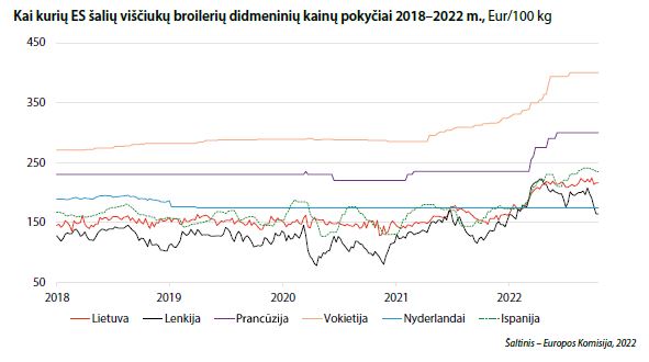 Palyginus stambiausių ES viščiukų broilerių gamintojų ir Lietuvos didmeninių kainų pokyčius 2018–2022 m., galima pastebėti kelis įdomius aspektus. Didmeninės kainos Vokietijoje ir Prancūzijoje itin išsiskiria – yra gerokai aukštesnės. Nyderlanduose, Vokietijoje ir Prancūzijoje jos mažiausiai svyruoja, palyginti su Lenkija ir Ispanija. Vadinasi, kai gamintojų arba vartotojų lygmeniu kainos pakyla arba nukrinta, ši našta nepasiekia viščiukų broilerių tiekimo grandinės, o tai gali pažeisti rinkos dalyvių gerovę. Nuo 2021 m. visos šalys, išskyrus Nyderlandus, didina viščiukų broilerių kainas. Pokyčius lėmė panašūs veiksniai, kaip ir kiaušinių gamyboje, kur svarbus vaidmuo teko ligų protrūkiams, brangstantiems pašariniams augalams ir geopolitinės situacijos raidai.