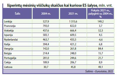 Vertinant Lietuvos paukštienos ir kiaušinių gamybos situaciją ES kontekste galima teigti, kad mūsų šalies gamintojai nelaikomi rimtais žaidėjais bendrojoje rinkoje. Vištų populiacijos pokyčiai įstojus į ES nerodo poslinkių, kuriuos galima sieti su gana reikšmingu gamybos pajėgumo didinimu, iš esmės keičiančiu ES rinkos situaciją. Mūsų šalyje 2004-ųjų pradžioje vištų buvo 7,87 mln., 2021 m. jų skaičius padidėjo iki 8,12, o 2022 m. pradžioje siekė net 8,90 milijonų. Jų dalis paukščių struktūroje beveik nekito – 2004 m. sudarė 97,54 proc., 2021 m. – 97,14, o 2022 m. – 98,57 procentų.