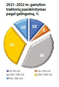 Iki 50 AG įregistruota 255 vnt. arba 20 proc. traktorių. Mažiausią dalį sudaro 50–100 AG traktoriai – jų įregistruota 69 vnt. arba 5,4 proc. Didžiausią dalį sudaro 100–200 AG traktoriai. Ši 460 traktorių grupė užima 36 proc. visų 2022 m. įregistruotų naujų traktorių. 200– 300 AG galios traktoriai sudaro 29 proc. (370 vnt.), o didesnės kaip 300 AG – 9,6 procento (122 vnt.). Tarp praėjusiais metais įregistruotų traktorių 2022 m. gamybos – 798 vnt., 2021 m. – 478 vnt., tad einamųjų metų traktoriai sudaro daugiau kaip 60 proc. įregistruotų naujų traktorių.