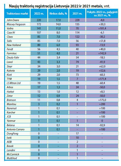 Visi nauji, t. y. 2021–2022 m. gamybos, traktoriai Lietuvoje registruoti pirmą kartą. Tarp visų įregistruotų 1 276 naujų traktorių 2022 m. gamybos sudaro daugiau kaip 60 procentų.
