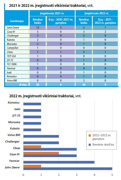 Traktorių, savaeigių ir žemės ūkio mašinų ir jų priekabų registro duomenimis, praėjusiais metais žemdirbiai iš viso įregistravo 24 vikšrinius traktorius, vienu mažiau nei 2021 metais. Iš jų 4 traktoriai yra 2021–2022 m. gamybos. Mažiausios (12,72 kW / 16,5 AG) galios – 2007 m. gamybos Iseki TPC183 vikšrinis traktorius, galingiausias (467 kW / 607 AG) – 2021 m. gamybos Case IH Quadtrac 580.