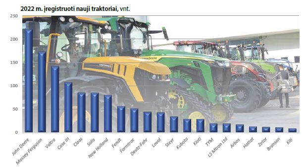 Populiariausių naujų traktorių lyderiai – John Deere, jų įregistruota 220, o tai 9 vnt. arba 4 proc. mažiau nei 2021 metais. Iš jų 58 vnt. yra 2021 m. gamybos, 162 – pagaminti 2022 m., šešiolika mašinų – iki 50 AG galios. Daugiau kaip 60 proc. įregistruotų John Deere traktorių sudaro 6M ir 6R serijos mašinos, atitinkamai 76 ir 64 vienetai. Tarp galingiausių populiariausi 8R serijos traktoriai – jų pernai įregistruota 41. 7R serijos John Deere pernai įregistruoti 9, 9R – vienas.
