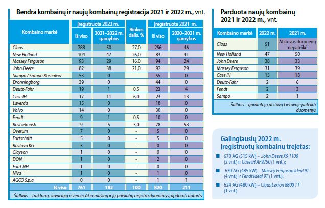 Daugiausia (50 vnt.) įregistruota naujų Claas kombainų, „Baltic Agro Machinery“ teigimu, parduota 51 vienetas. Populiariausias Lexion modelis (40 vnt.). Claas kombainai užima 27 proc. 2022 m. Lietuvos naujų kombainų rinkos. Antroje vietoje – New Holland: 47 vnt. ir 26 proc. rinkos, trečioje – John Deere: 38 vnt. ir 21 proc. rinkos. Įmonių „Lytagra“ ir „DOJUS agro“ teigimu, parduotų ir įregistruotų kombainų skaičiai sutampa.