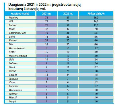 Beveik 50 proc. naujų 2022 m. įregistruotų krautuvų rinkos dalijasi 4 gamintojų mašinos: Manitou (16,0 proc.), JCB (14,8), Bobcat (11,3) ir Merlo (7,0 proc.).
