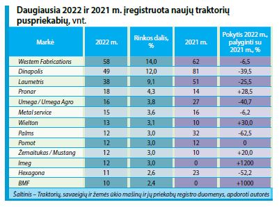 Daugiausia įregistruota Metal-Fach (22 vnt.), Hexagona (15), Wielton (12), Pronar (11) ir Dinapolis (10 vnt.) naujų traktorių priekabų. Kitų pernai įregistruotų naujų priekabų seka: Caselli Treyler (8 vnt.), Bobruiskagromash (7), Zaslaw (6), Koksal, Palms ir Umega Agro (po 5), 2PTS-6-2 ir Western Fabrications (po 4), Cynkomet ir ZKT (po 3), Kesla, Metaltech ir Palazoglu (po 2), Bicchi, Metal service, Slma ir Strautmann (po 1 vnt.). 70 proc. (91 vnt.) visų naujų priekabų pagamintos 2022 m., 30 proc. (39 vnt.) – 2021 metais.