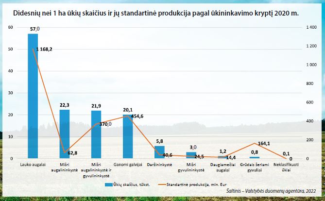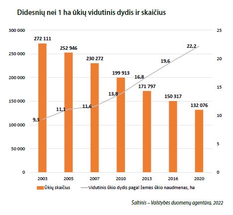 Nuo 2020 m. labiausiai sumažėjo ūkių, turinčių 2–5 ha, 1–2 ha ir 5–10 ha žemės ūkio naudmenų. Palyginti su 2010 m., šis rodiklis krito atitinkamai 52, 48 ir 34 procentais. Didelių ūkių, turinčių daugiau kaip 100 ha žemės ūkio naudmenų, daugėjo. 2020 m. jų buvo 5,8 tūkst. – sudarė 4 proc. visų ūkių ir valdė daugiau nei pusę šalies naudojamų žemės ūkio naudmenų. O štai 2010 m. tokių ūkių buvo 3,8 tūkst. (2 proc. visų ūkių), jiems priklausė net 42 proc. naudojamų žemės ūkio naudmenų. Šie duomenys rodo Lietuvos ūkių stambėjimo tendenciją, tačiau vis dar yra daug mažų ūkių, kurie augina ir gamina produkciją.