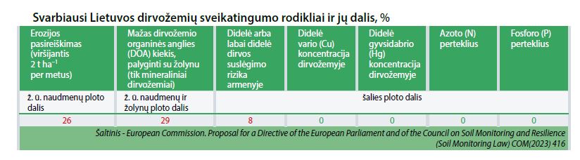 Nurodomos šios didžiausios mūsų šalies dirvožemių sveikatingumo problemos: mažas dirvožemio organinės anglies (DOA) kiekis; dirvų erozija; didelė dirvų suslėgimo rizika. Sunkiųjų metalų vario (Cu) ir gyvsidabrio (Hg) koncentracijos dirvožemyje pavojaus nekelia. Būtina pažymėti, kad nei azoto, nei fosforo perteklinių kiekių Lietuvos dirvožemiuose nenurodoma. Tai gera žinia ne tik žemdirbiams, bet ir visuomenei. Tai argumentai tiems, kurie vis dar galvoja, kad žemės ūkis yra didelis gamtos teršėjas.