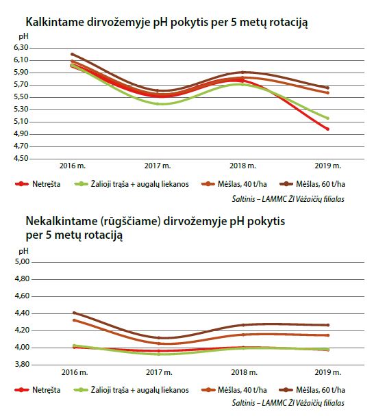 Atlikus tyrimus 2016 m. nustatyta, kad netręštame I var. dirvožemio pHKCl buvo 6,0; tręštame žaliąja trąša / augalų liekanomis (II var.) – pHKCl 6,0; tręštame mėšlu 40 t ha-1 (III var. ) – pHKCl 6,1; tręštame mėšlu 60 t ha-1 (IV var.) – pHKCl 6,2.