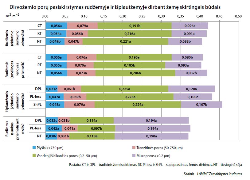 Tyrimų duomenys parodė, kad moreninės kilmės išplautžemyje (Vėžaičiai) ir rudžemyje (Dotnuva) yra daugiau vandenį kaupiančių porų nei limnoglacialiniame sunkios granuliometrinės sudėties dirvožemyje (Joniškėlis).