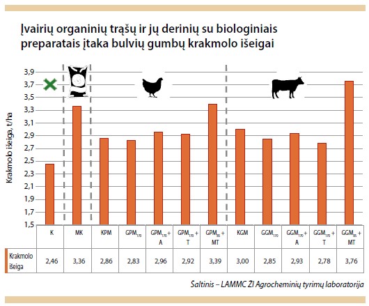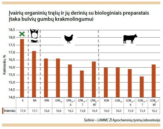 Vertinant bandymuose tirtų trąšų efektyvumą, nustatyta, kad įvairios organinės trąšos (tiek kraikinis, tiek granuliuotas mėšlas) mažino bulvių gumbų krakmolingumą, palyginti tiek su netręštais augalais (kontrolė), tiek su tręštais mineralinėmis trąšomis (MT). Paukščių mėšlu tręštų bulvių gumbuose krakmolo kiekis buvo kiek didesnis negu tręštųjų įvairių formų galvijų mėšlu.