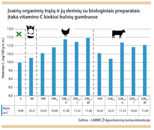 Vertinant trąšų efektyvumą, visos bandyme naudotos trąšos, palyginti su netręštais augalais (kontrolė – K), didino vitamino C kiekį bulvių gumbuose. Dėl paukščių mėšlo įtakos gumbuose vitamino C susikaupė daugiau nei tręšiant įvairių formų galvijų mėšlu. Biologiniai preparatai, naudoti deriniuose tiek su paukščių, tiek su galvijų mėšlu, taip pat tendencingai didino vitamino C kiekį gumbuose. Tikėtina, kad minėti preparatai, stiprindami augalų šaknų sistemą, pagerino maisto medžiagų pasisavinimą ir taip prisidėjo prie vitamino C kaupimosi. Itin ryškūs teigiami pokyčiai nustatyti laukeliuose, tręštuose granuliuotu paukščių ar galvijų mėšlu kartu su Azotobacter spp. arba su Trichoderma spp., taip pat kartu su mineralinėmis NPK trąšomis.