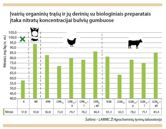Eksperimente visos naudotos trąšos didino nitratų kaupimąsi bulvių gumbuose, ypač mineralinės trąšos (tiek kartu su granuliuotu įvairiu mėšlu, tiek jomis tręšiant atskirai). Pakriku mėšlu tręštų bulvių gumbuose nitratų nustatyta kiek daugiau nei naudojant granuliuotą mėšlą.